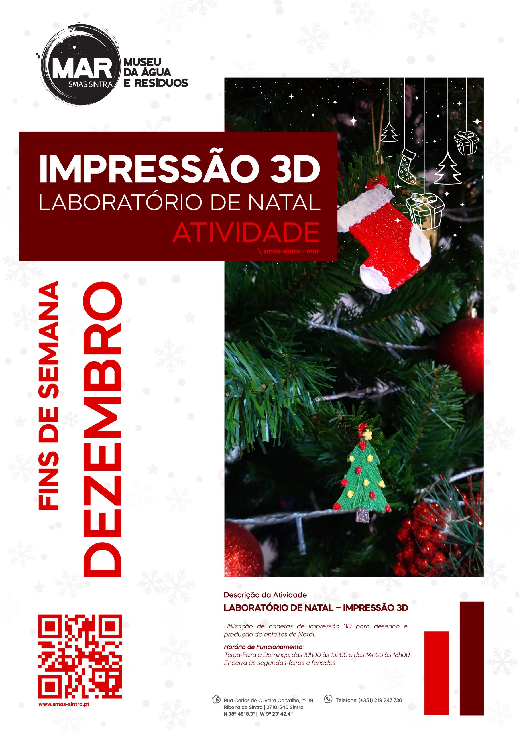 Para além da peça de teatro, os SMAS de Sintra desafiam ainda as famílias a participarem aos sábados e domingos, durante o mês de dezembro, na atividade “Laboratório de Natal-Impressão 3D”, em que, com recurso a canetas de impressão, são produzidos enfeites de Natal, utilizando filamento de plástico biodegradável. Uma atividade dinamizada a qualquer hora aos fins de semana, em função da afluência ao espaço, e que, neste caso, pretende que a diversão e a aprendizagem em família se perpetuem nesta época especial. Uma atividade que se insere no âmbito da Estratégia Municipal de Educação e Sensibilização Ambiental do Município de Sintra, em convergência com os Objetivos de Desenvolvimento Sustentável 2030, a agenda das Nações Unidas para o desenvolvimento social, económico e ambiental à escala planetária.