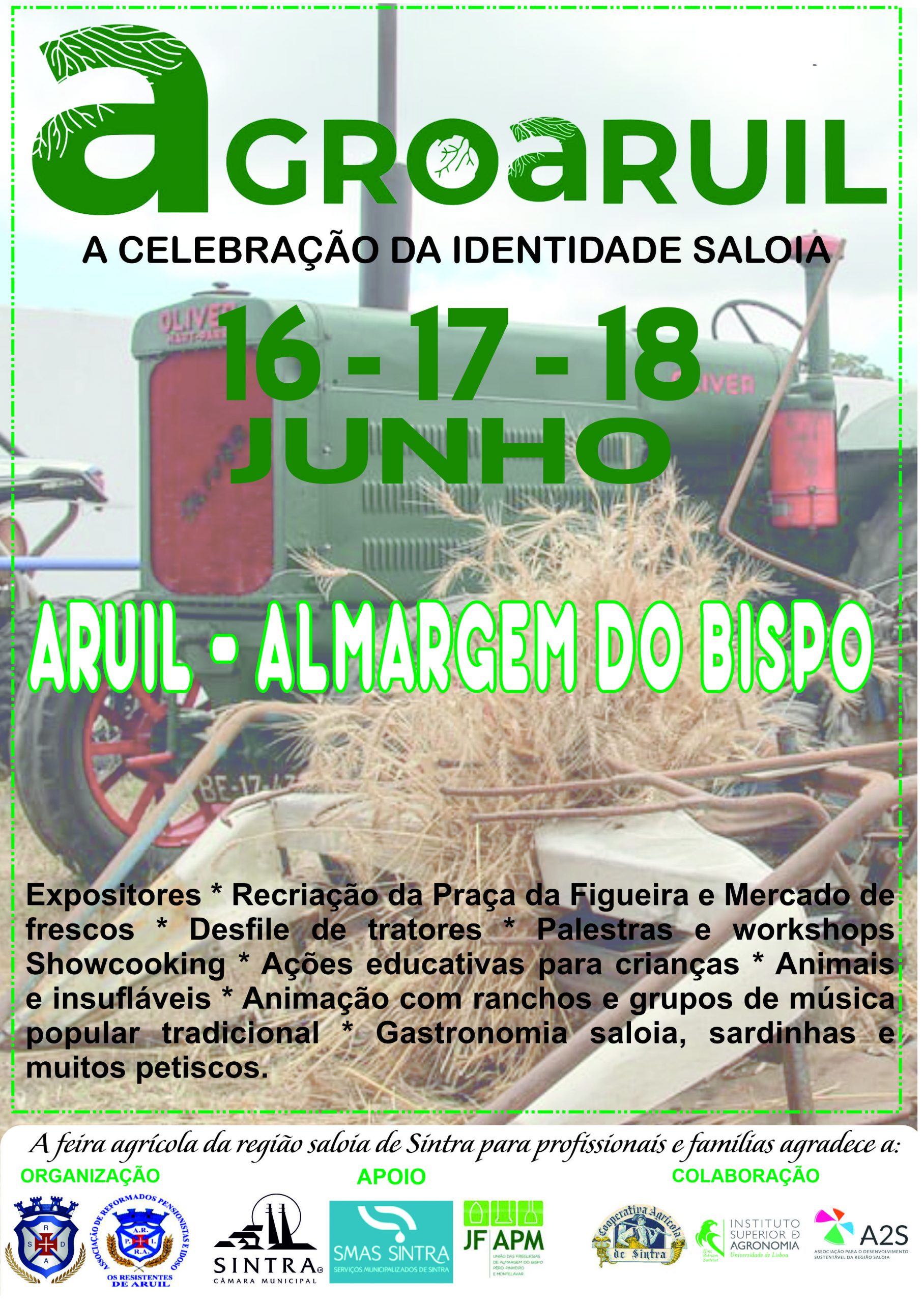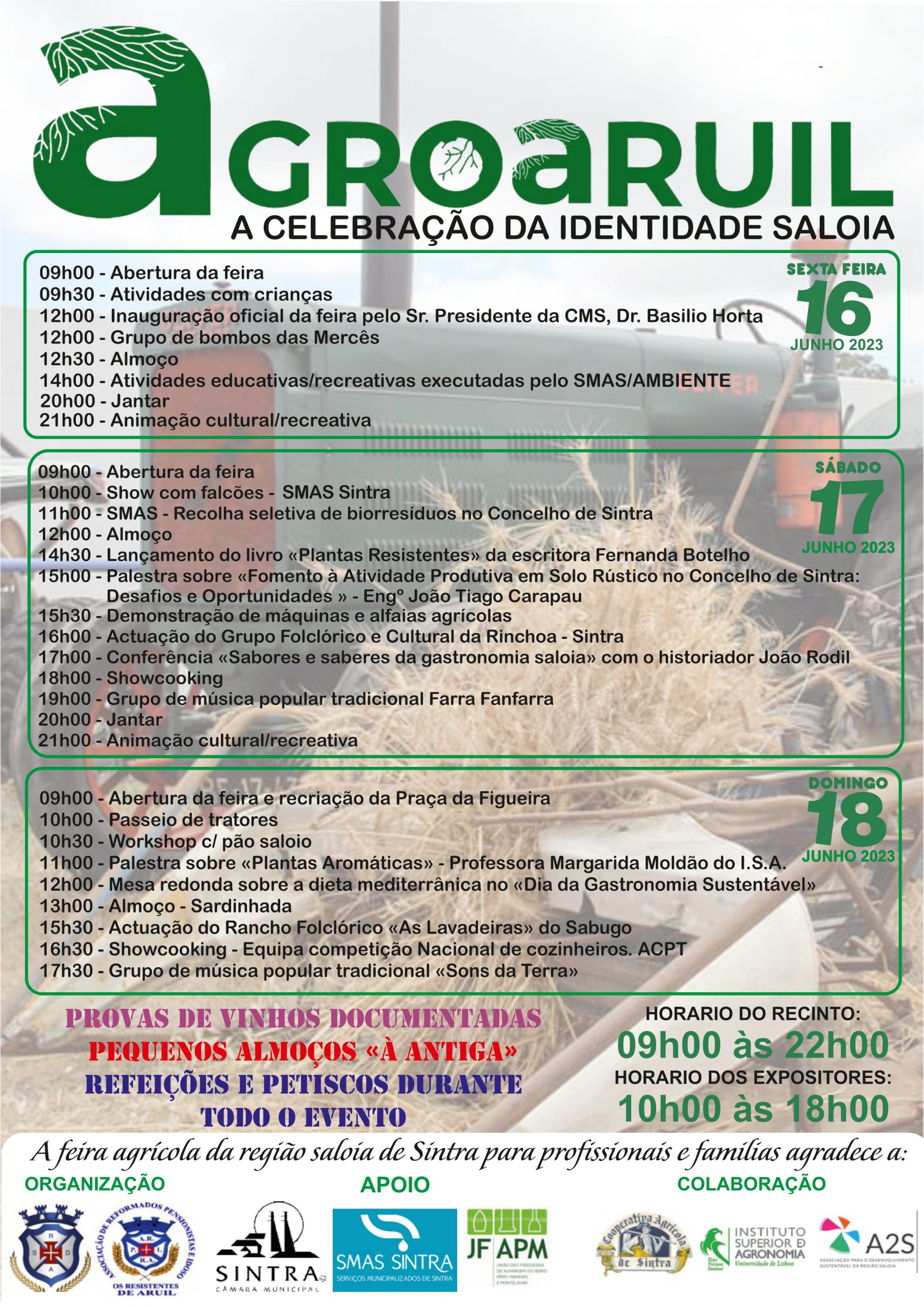 Com inauguração agendada para sexta-feira, dia 16, pelas 12h00, com a presença do presidente da Câmara de Sintra, Basílio Horta, o primeiro dia será dedicado à dinamização de atividades educativas e recreativas para as crianças de várias zonas do concelho. Com as aves de rapina e os biorresíduos em destaque na manhã de sábado, através de demonstrações de voo e de uma palestra, a cargo dos SMAS de Sintra, a tarde contará com o lançamento do livro “Plantas Resistentes”, da autoria de Fernanda Botelho, seguindo-se, pelas 15h30, uma demonstração de máquinas e alfaias agrícolas. Para além de animação musical no recinto, o “campo da bola” de Aruil, a programação conta, ainda, com uma conferência sobre “Sabores e Saberes da Gastronomia Saloia” (sábado, às 17h00), pelo historiador João Rodil, e um showcooking (às 18h00).